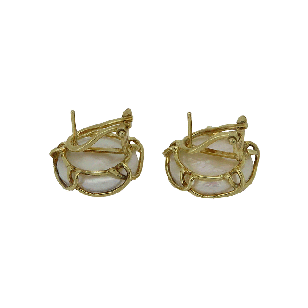 Orecchini con perle barocche a lobo con lavorazione martellata in argento dorato. Chiusura a clip con perno.