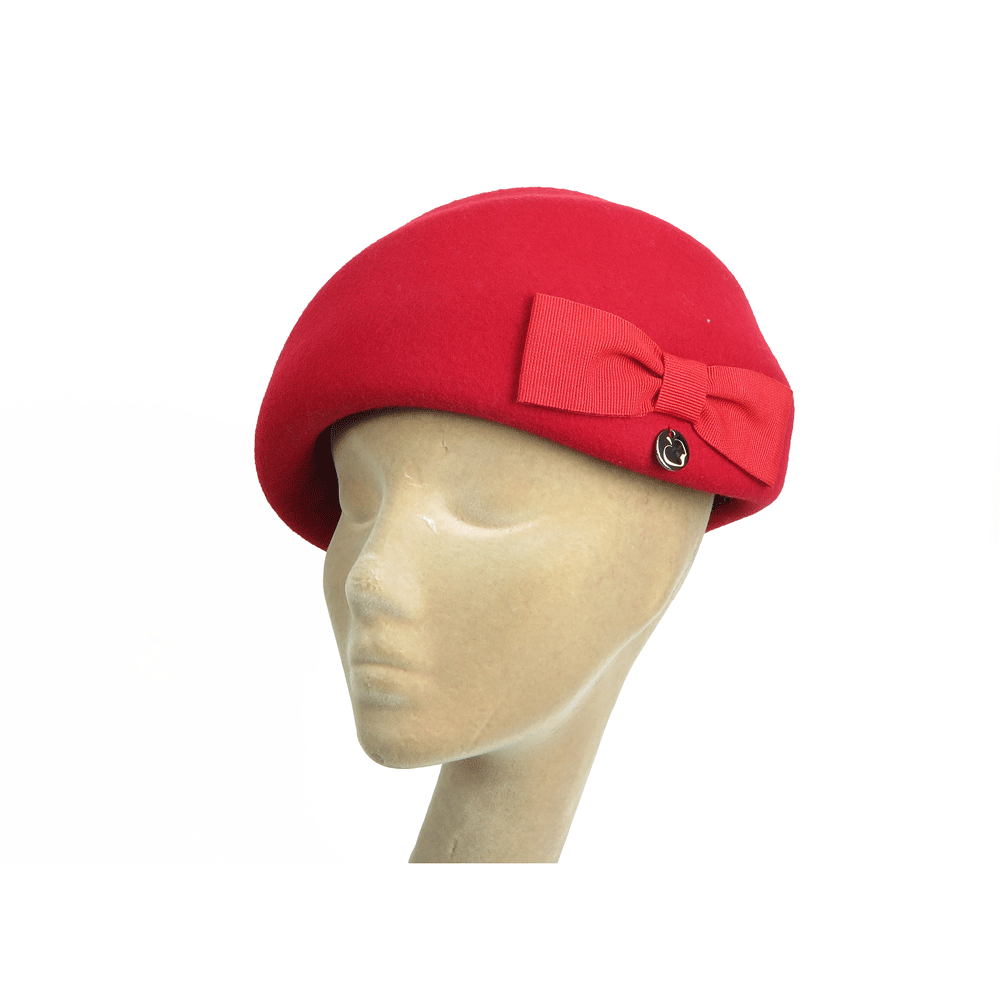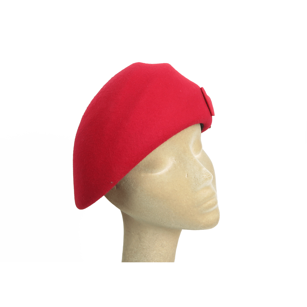 Particolare coppola rigida rosso fuoco con fiocco piatto in tinta da indossare lateralmente.