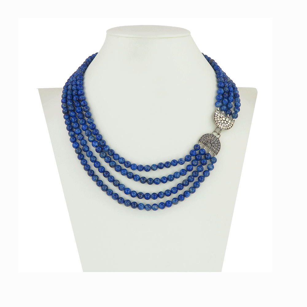 Natural Lapis Lazuli Necklace four-strand with a very elaborate silver clasp. The clasp can be worn on the side as a decoration or on the back so as not to show it.